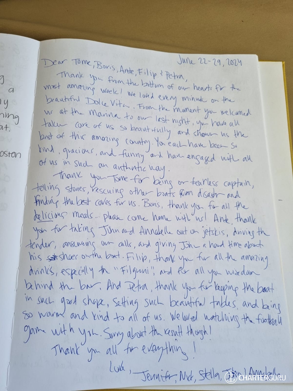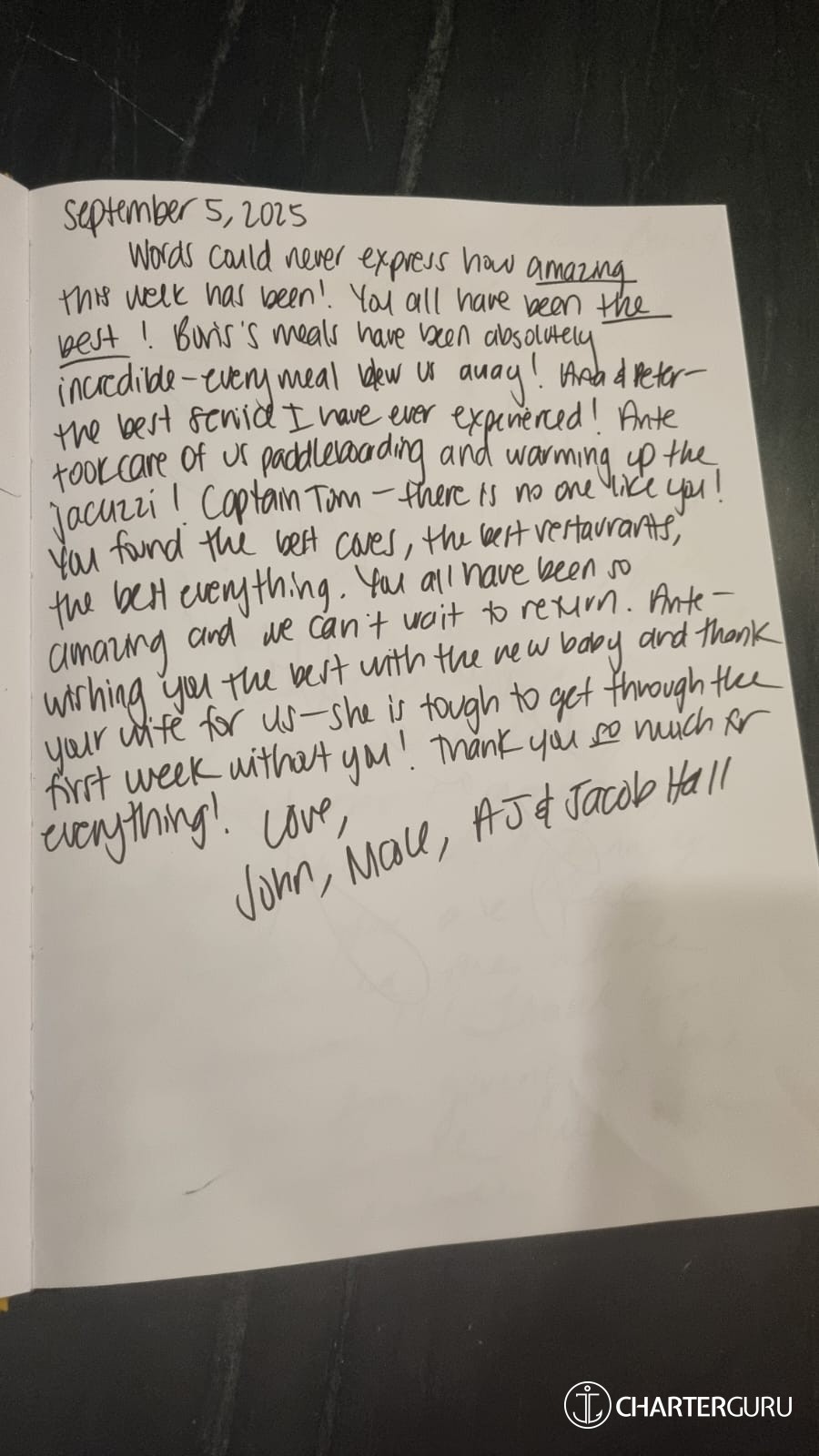 experienced! Ante took care of us paddle boarding and warming up the jacuzzi! Captain Tom - there is no one like you! You found the best coves, the best restaurants, the best everything. You all have been so amazing and we can’t wait to return. Ante - wishing you the best with you new baby and thank your wife for us - she is tough to get through the first week without you! Thank you SO much for everything!”