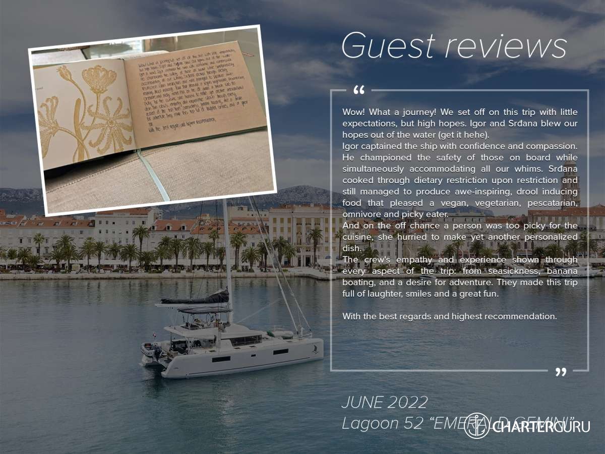 EMERALD GEMINI is offered primarily as a sailing catamaran. The central space of the yacht is the main saloon, which connects to the aft deck. The aft deck is expansive, with a comfortable dining and seating area and that's where the guests spend most of their time. The tasteful cabins are located in the 2 massive hulls. The cabins are located in the 2 massive hulls. Multiple portholes connect you with the outside world.